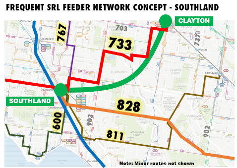 733 Sandringham - Box Hill SRL SmartBus: Proposed as the SRL's precursor due to the existing Route 733 passing near three of the six SRL station sites (Box Hill, Monash Clayton, Clayton). This upgrade would retain the current 733 alignment between Box Hill and Clayton with the southern end extended to Southland and Sandringham (via Bay Rd). This would bring high quality transport to Clarinda and build patronage to the SRL corridor in the years before its opening. More on SRL SmartBus